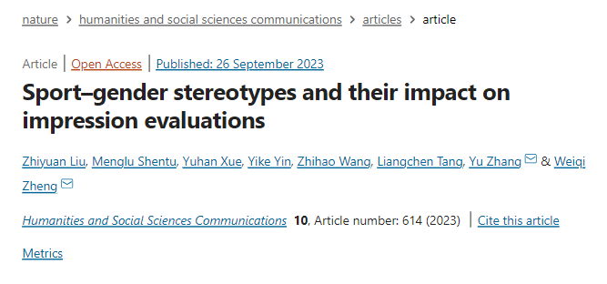 2023年9月26日,金沙心理学院2020级本科生刘志远及其课题小组在该院张禹和郑玮琦老师的指导下,在国际顶级期刊《自然》(Nature) 的旗下期刊《人文与社会科学通讯》(Humanities & Social Sciences Communications) 发表了题为“运动-性别刻板印象及其对印象评价的影响”(Sport–gender stereotypes and their impact on impression evaluations)的研究论文。《Humanities & Social Sciences Communications》是Nature旗下唯一的人文社科综合类刊物,同时被A&HCI与SSCI收录,位列SSCI的Q1区序列。该刊致力于出版人文与社会科学所有领域的高水平研究,在国内外的人文社科领域具有重要影响力。