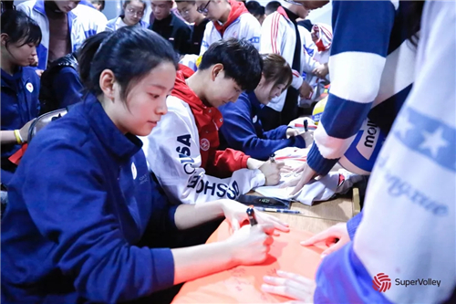 交流结束后,宝清第一高级中学的同学们拿出球衣、球等物品找到队员和教练签名合影留念。