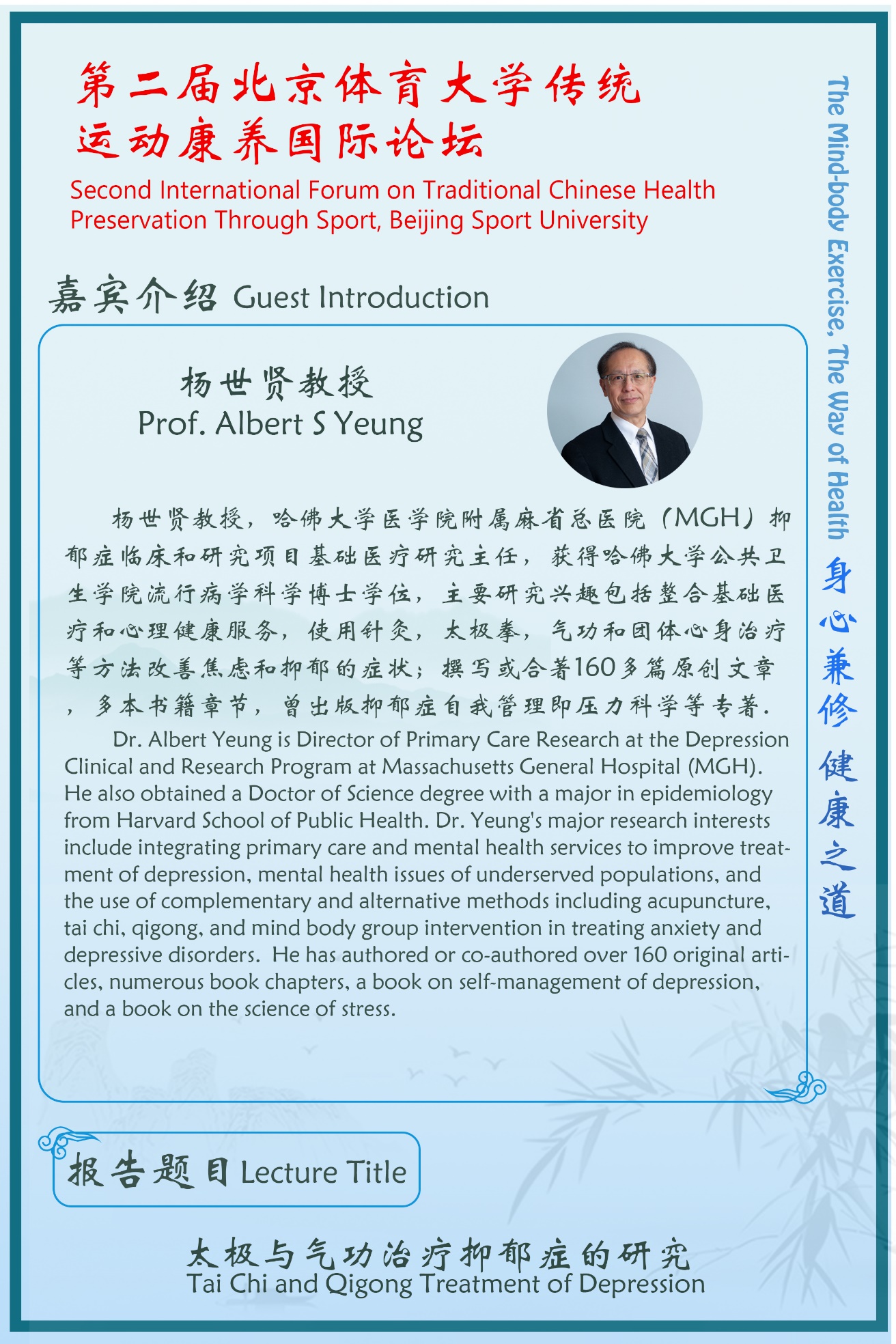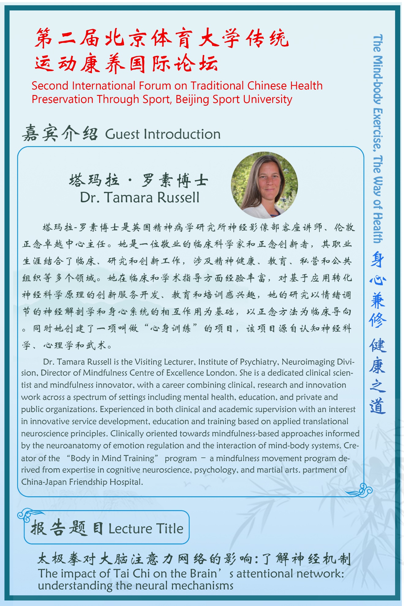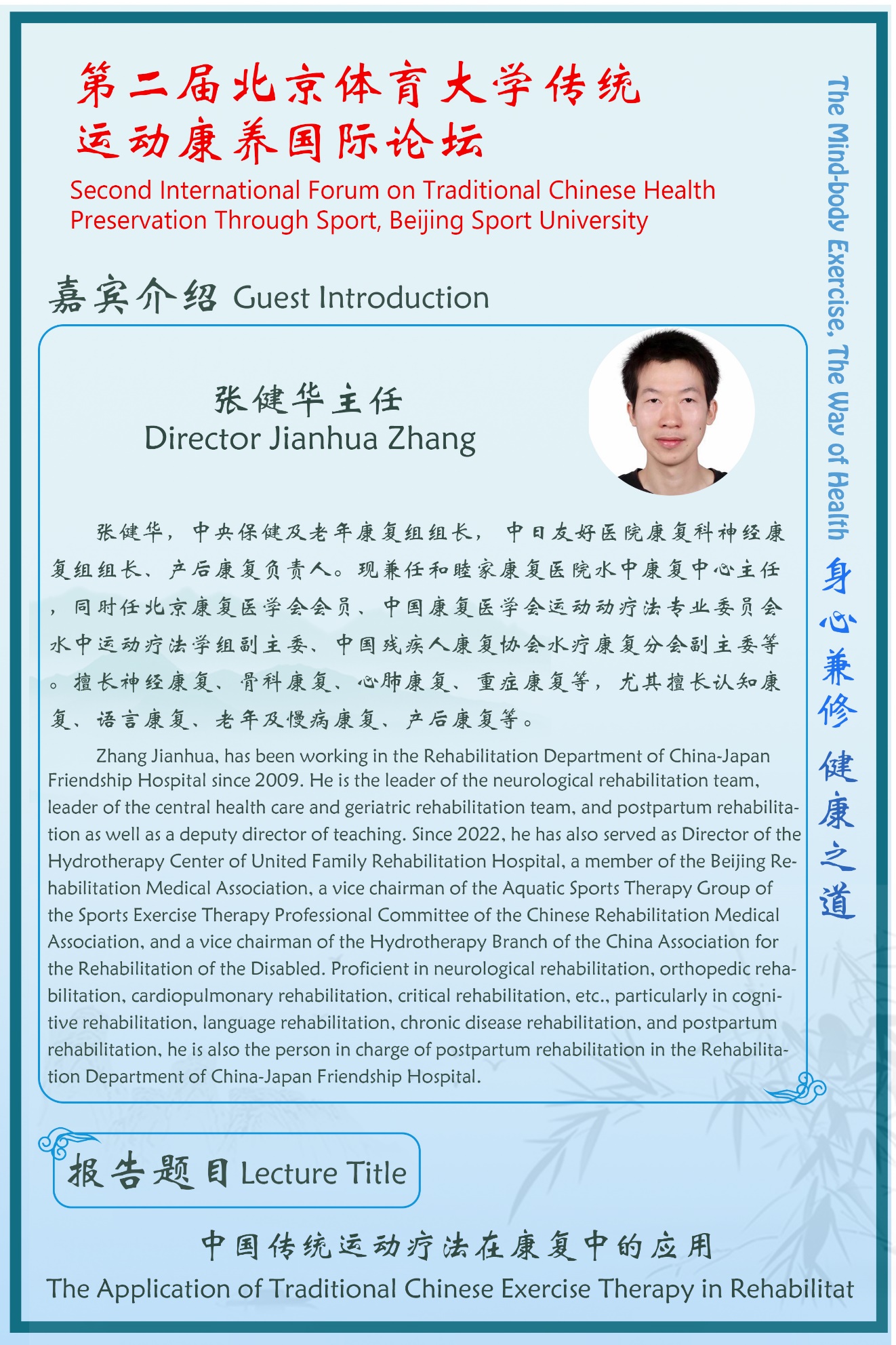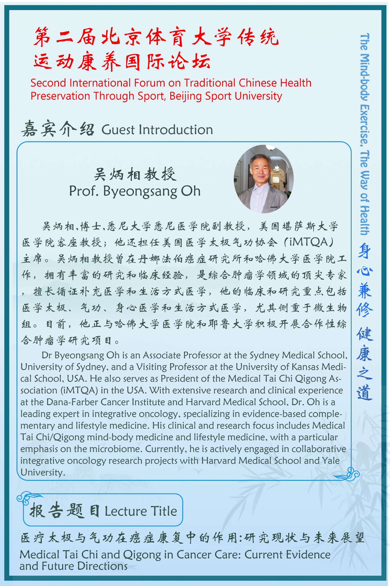 Traditional Chinese Health Preservation Culture, which combines the health promotion and disease prevention, is the valuable treasure that benefits human health with several thousand years of history. Beijing Sport University wishes to facilitate domestic and international academic communication and scientific research cooperation in traditional Chinese sports health promotion and disease treatment and prevention, to explore the research field of traditional Chinese exercise health promotion, and to contribute to human's health with the theme of "Promoting the Communication of Health Preservation Through Traditional Chinese Sport at Home and Abroad, Guiding the Development of Traditional Chinese Health Preservation Research"