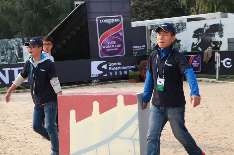 场地区的志愿者公认获得“最佳劳模奖”,他们由30名男生组成,承担着最繁重的工作。包括:提前布置赛场,摆放障碍物、规划路线及帮助选手管理马匹。每场比赛开始前,志愿者需要在10—15分钟内完成赛场布置,不同的比赛要求选手采用不同的路线,场地障碍物的数量和位置也不尽相同,所以需要志愿者在最短时间内完成工作。随着比赛场次、选手的增加,志愿者的工作越来越繁重,但是他们始终任劳任怨,保证比赛的顺利进行,为所有志愿者树立了一个标杆。