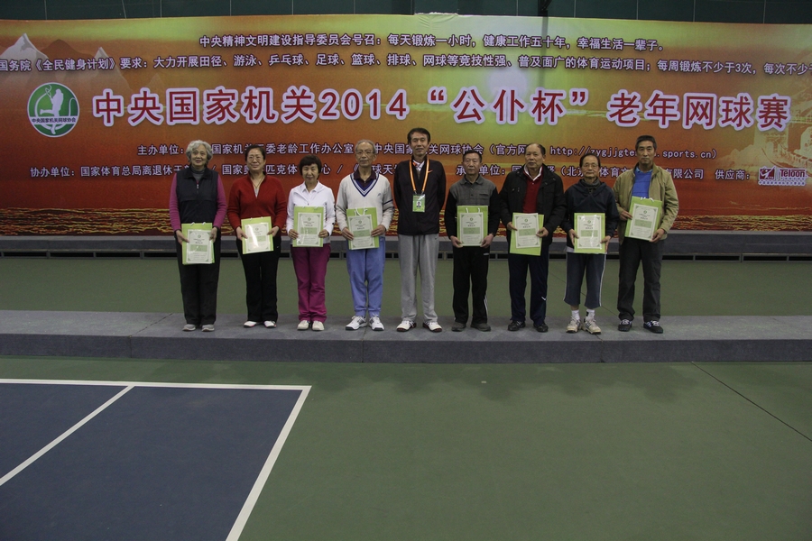 2014年2月26日下午,中央国家机关2014“公仆杯”老年网球赛(特邀组)在国家奥林匹克中心网球馆圆满举行,刘刚处长带领金沙离退休老同志参加了比赛,全体参赛队员不畏老,经过顽强拼搏,取得了较好的成绩。夏怀珍和钱幽萍荣获女子组一等奖;李克健和袁作生、许福秀和刘清玉分获男、女组二等奖;邢文华和李兆华、刘家骥和李志勇、赵秀忠和孔国强荣获男子组三等奖。