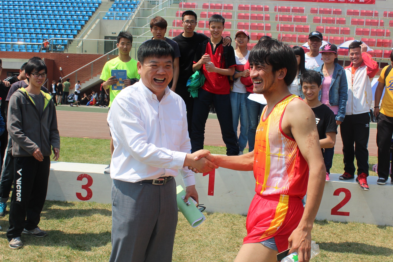 2014年4月22日上午11点35分,教育学院2011级学生阿卜杜克热木(比赛序号:147)在校运会男子乙组1500米比赛中,以4分34秒91的优异成绩打破校运会纪录,获得男子乙组1500米第一名。比原纪录(4分37秒90)突破2秒99。