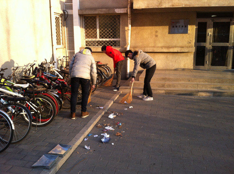 体育艺术系同学们在辅导员以及年级干部的带领下,组成多个志愿团队,践行雷锋精神。他们在体大家属院老年活动中心进行志愿清扫活动,前往北京海淀明圆小学进行献爱心义务支教活动,在金沙工作人员的指导下,对餐饮大楼的地面卫生及杂物进行整理,并且在号公寓楼周边开展摆放自行车、打扫地面、剔除墙上的小广告了劳动实践活动。并且利用形势政策课的时间,在教学楼开展了学习雷锋精神的主题会议,分别到各自专项训练场馆以及北六楼门前进行卫生大扫除活动。
