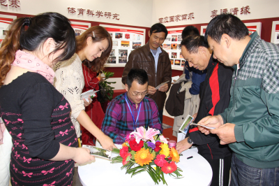 年奥运会举重冠军、附属竞技体育学校副校长张国政也应党委宣传部邀请,来到学校展区为参观者签赠校园风光卡片,并